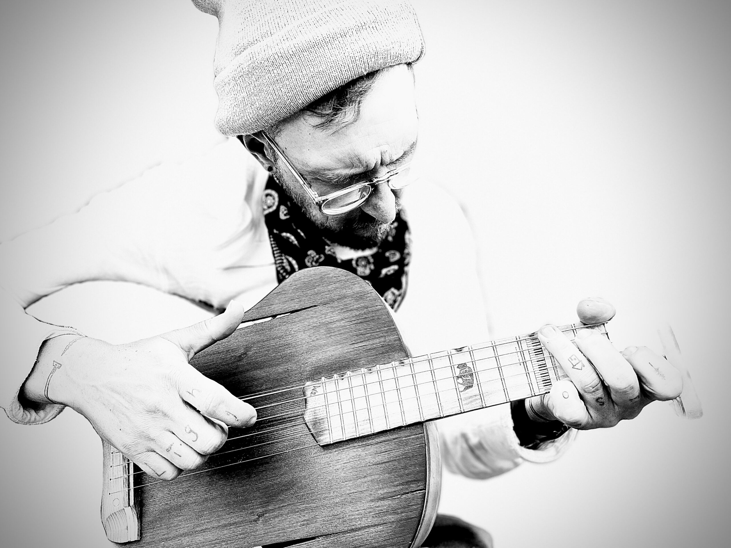 His songwriting is real – the stories within and the practice of being well, honorable, decent, connective, and deep are all flexes on the reality he renders – his art is massively supported by full immersion of the self into it – every aspect – every step. His shop and studio are also on the island where he lives, wanders, and pokes at the nature of the curious mind. In the shop, he builds instruments primarily from reclaimed sources (100+ year old pianos / Red Rock Amphitheater Benches / naturally felled tree). In the studio, and wandering the island in the many hours of each day, he has learned to pull the strings around on most stringed instruments. His mind hears symphonies, his heart (Coyote) drives him to create them by pulling the whole world through his Spirit (Ala) and into a form of art, music, poetry, and dreams pushed into reality.